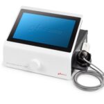 The therapy is performed with a 5 cm² transducer made of high-quality titanium (optional: 2.5 cm²). The transducer is made of high-quality titanium (100% skin-friendly, robust and durable). Each transducer can be used for both frequencies. An acoustic coupling control can be switched on optionally. The transducers are waterproof and can also be used for treatment in a water bath.