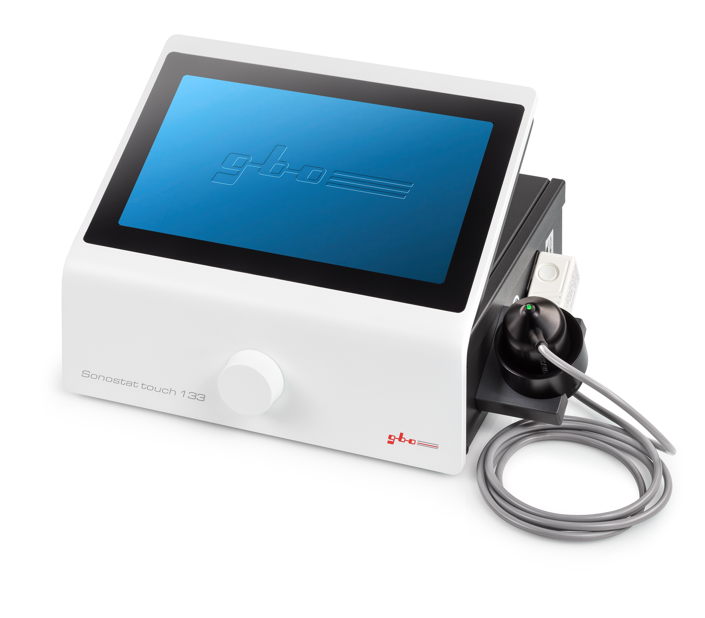 The affordable entry into ultrasound therapy! Sonostat 133 touch is an ultrasound therapy device for continuous and pulsed ultrasound (1:5, 1:10, 1:20). All applications are easy and safe to perform. Deep-lying regions are treated with a frequency of 1 MHz and a maximum intensity of 3 W/cm². For superficial applications, the frequency of 3 MHz is used, and the maximum intensity is 1.5 W/cm². The data are valid for continuous and impulse sound.