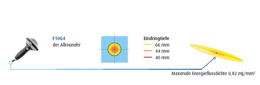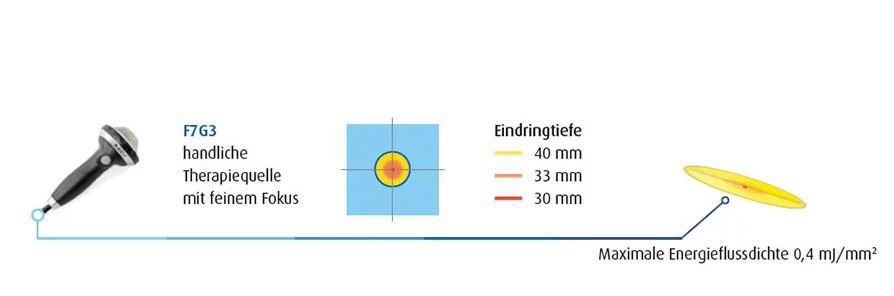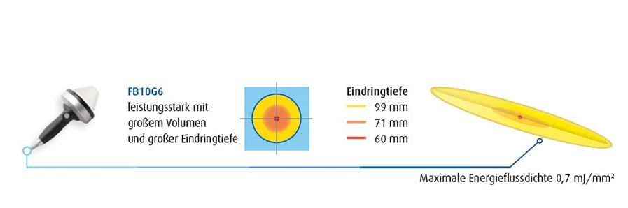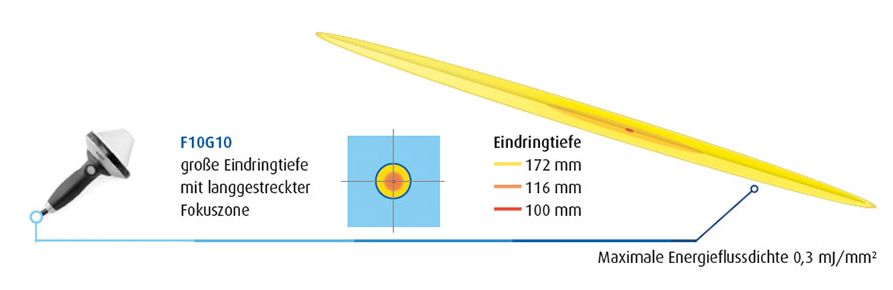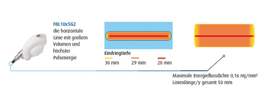 - Ein vielfach vergrößertes Behandlungsvolumen – 40 bis 50 mal größer als bei der punktförmig fokussierten Therapiequelle – dadurch schnellere und homogenere Applikation