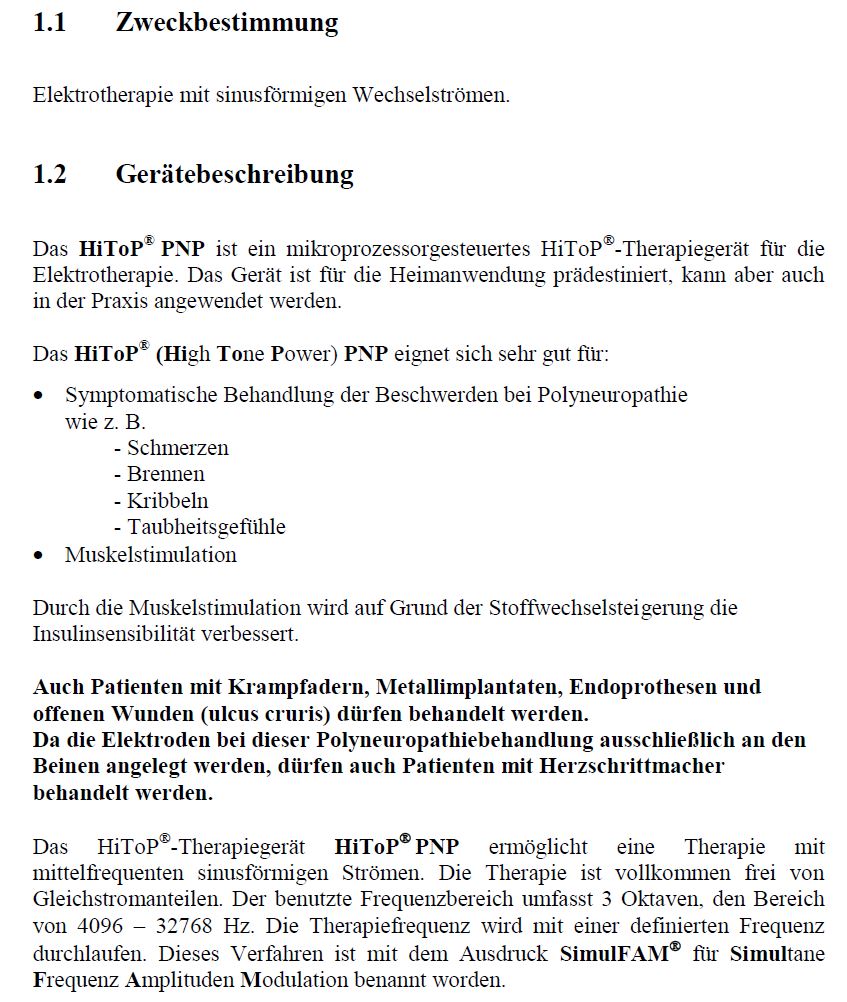 Mit HiToP 191/PNP ist Hochtontherapie in einem kompakten Heimtherapiegerät verfügbar. Abgegeben wird Simulfam X. Damit ist das Frequenzfenster etwas geringer als bei Simulfam I und je nach eingestellter Intensität ist Muskelkontraktion möglich. Haupteinsatzgebiet von HiToP191/PNP ist die Behandlung von Polyneuropathie unabhängig von der Ursache, siehe Zweckbestimmung. Es profitieren auch Menschen mit Missempfinden, bei denen die im NLG gemessene Nervenleitgeschwindigkeit noch nicht reduziert ist (Small-Fibre-Neuropathien). Die Therapie kann als Maßnahme zum Muskelerhalt genutzt werden, es ist bei Long-COVID Patienten auf die Pacing-Bilanz zu achten.